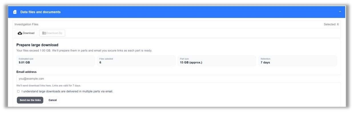 Download requests larger than 1GB are now delivered via email, rather than downloading directly from the website. This allows the system to prepare your files in the background so you can continue working without delays, accessing the files at your convenience once your request is processed.