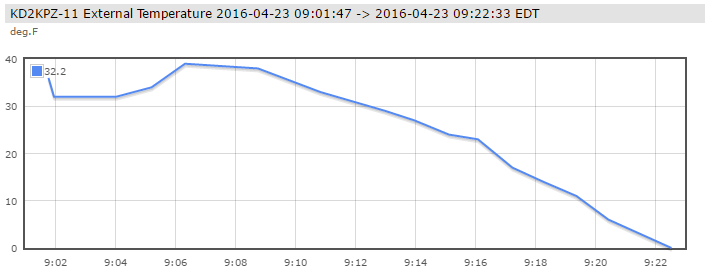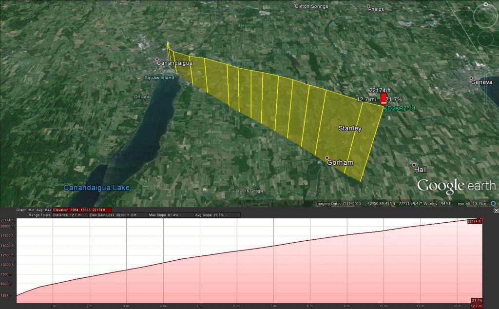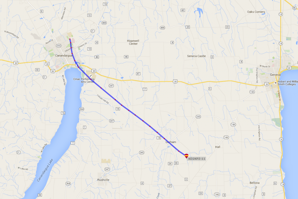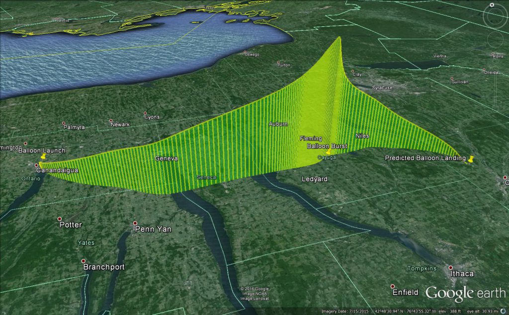 OLHZN-1 was the first high altitude weather balloon flight attempt for Overlook Horizon High Altitude Balloons that took place on Saturday, April 23, 2016. The goal of the first flight was to get comfortable with the launch and recovery methods and to test all our systems. Sadly, the payload itself was lost and not recovered. The launch itself had a great start. We were a little off on the amount of time needed to prepare the launch and ended up launching at 8:58:37am EDT (12:58:37 UTC) which is just about an hour later than we hoped to launch. That’s not a huge issue, but probably slightly annoying for our live stream viewers that had to wait an extra hour for launch. We eventually got all systems attached, powered and ready to go. It was very cold (about 38° F / 3° C) and a little on the windy side during launch prep. Likely, we’ll try to avoid that in the future. The cold conditions led to us rushing a bit to get it launched and the windy conditions made it difficult to verify that the balloon was filled to the proper volume. Upon liftoff, the balloon operations were fantastic. The radio tracking signals were much stronger than we expected and we were receiving perfectly clear signals despite the large distance between us and the balloon. Unfortunately, we received the last signal 27 minutes into the flight and then all transmissions ceased. At this time, we suspect that the power on the Arduino was drained faster than we expected and the Arduino lost power and all capability to transmit its position. We had a backup GPS locator on board that would use a 3G/4G cellular signal to report its location upon landing. The device was quite old and we were unsure how the battery life would perform. Additionally, we couldn’t be certain that it would land somewhere with cellular reception. Ultimately, this tracker never reported its position and completely failed due to either battery or lack of reception at the landing site. Unfortunately, the payload still remains undiscovered, but we obtained some great information from the flight while it was transmitting and we also learned much during the launch to refine those procedures for efficiency next time around. Check out Launch #2 for our return to flight and first successful payload recovery.