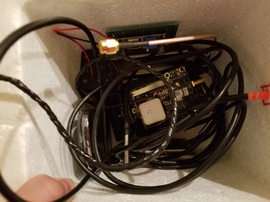 In addition to that, the launch itself was nearly a disaster due to the strong winds. At liftoff, a strong gust of wind pulled the balloon horizontal which caused the payload not to lift, briefly. The payload crashed into the ground and we heard one of the radio transmissions stop mid-transmission. This was a heartbreaking thought as we thought the flight was over before it was even 1 ft. off the ground. Luckily, the unit continued transmitting. We later discovered that the crash on liftoff caused the battery pack cover to dislodge and we can hear on the liftoff video when the Arduino reboots and goes through its power-up sequence as its lifting off. The Arduino would go on to power cycle (reboot) 14 times throughout the flight due to the batteries being loose with the dislodged cover. It’s amazing that it even kept transmitting.