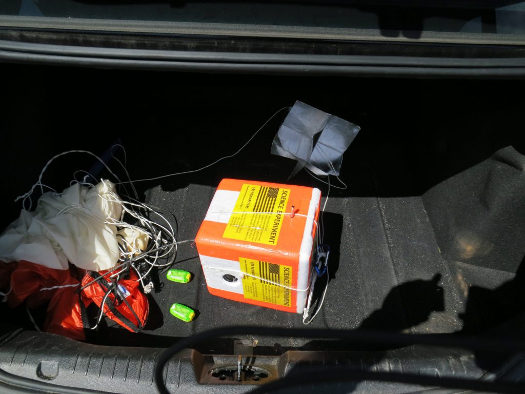 The balloon traveled to a maximum altitude of 90,141 ft. before bursting at 1:58pm EDT (17:58 UTC). It then came down in a hurry – only 36 minutes! Our next issue occurred when the unit stopped transmitting on the descent at 14,973 ft. and never transmitted again for the final 11 minutes of the flight. We again discovered that this was also due to the aforementioned loose batteries. Of the 14 power cycles (reboots) that occurred during the flight, 11 of them occurred during the final 11 minutes of the flight. This rapid power-cycling meant that the Arduino could not transmit as the software was set to send the first transmission at the 90 second mark after power-up. Since it continuously power cycled, it never reached the 90 second mark.