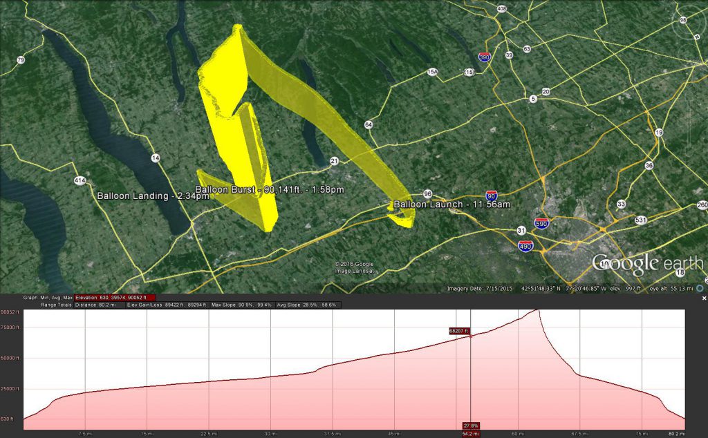The balloon traveled to a maximum altitude of 90,141 ft. before bursting at 1:58pm EDT (17:58 UTC). It then came down in a hurry – only 36 minutes! Our next issue occurred when the unit stopped transmitting on the descent at 14,973 ft. and never transmitted again for the final 11 minutes of the flight. We again discovered that this was also due to the aforementioned loose batteries. Of the 14 power cycles (reboots) that occurred during the flight, 11 of them occurred during the final 11 minutes of the flight. This rapid power-cycling meant that the Arduino could not transmit as the software was set to send the first transmission at the 90 second mark after power-up. Since it continuously power cycled, it never reached the 90 second mark.