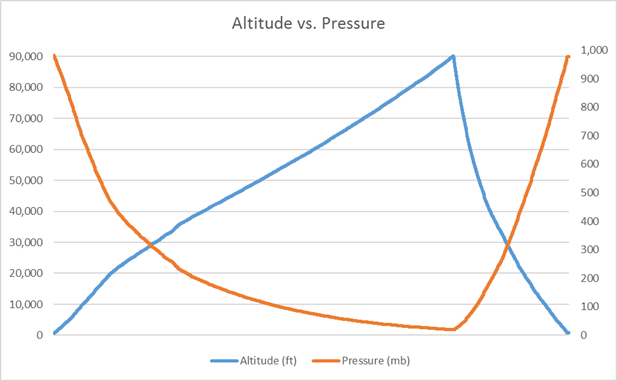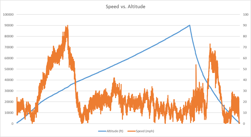 Here’s the full length of video capture we received as well as 2 highlights from airplane flybys during flight. Videos were recorded in 5 minute increments and then merged together post-flight. After each recording session, there was about 3 to 5 seconds of no recording while the camera saved the previous footage so occasionally the footage will jump. The telemetry overlays were added post-flight with the software DashWare. There were two nearby planes that passed the balloon in flight. Once occurred at about 22,500 ft. and 21:24 into the full-length video, the other occurred around 37,400 ft. and 42:00 into the full-length video. The camera batteries died around 43,000 ft. which was less than halfway to our 90,141 ft. maximum altitude achieved.